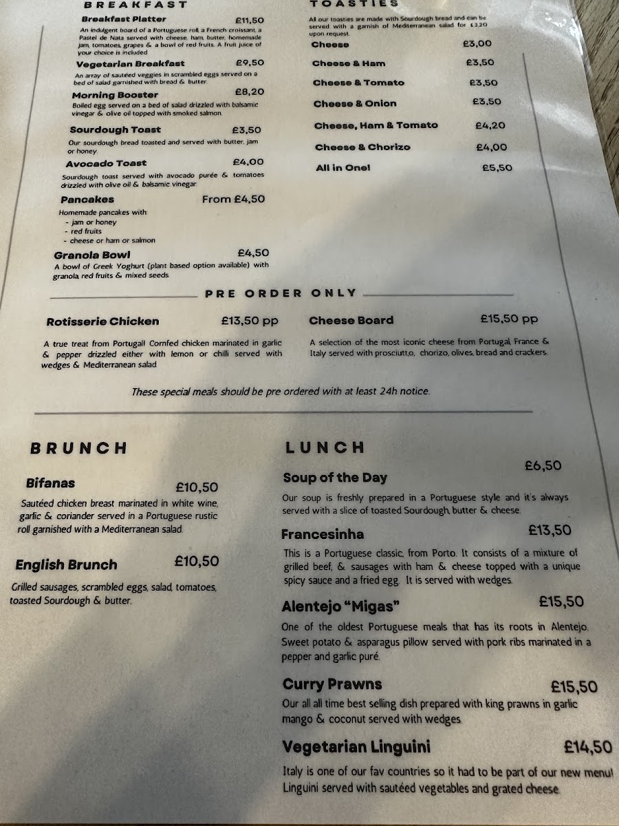 Guests can enjoy a variety of freshly baked pastries and tarts, such as almond croissants and fruit & custard tarts, alongside satisfying warm options like lentil soup or a classic Portuguese breakfast. The menu caters to different times of day, with breakfast plates, light brunches, and sweet treats that pair well with carefully brewed coffee or a smooth cappuccino.